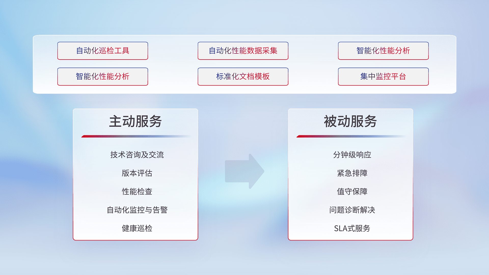 智能化工具和标准化文档,,,,保障服务质量,,,,提供主动服务(包含技术咨询、、、、版本评估、、、、性能检查、、自动化监控与告警、、健康巡检)和被动服务包含(分钟级响应、、、紧急排障、、、、值守保障、、问题诊断解决、、、SLA服务)。。。